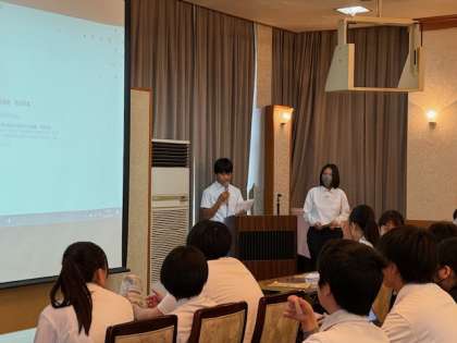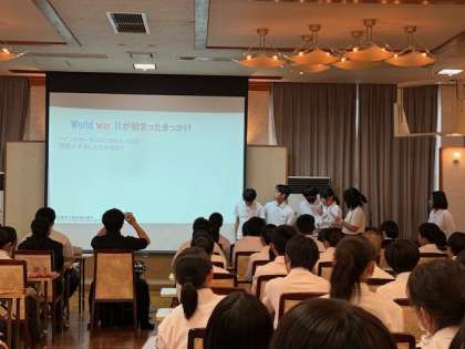 事前学習で行った平和学習のプレゼン発表で代表に選ばれた班が、全体での発表を行っています。