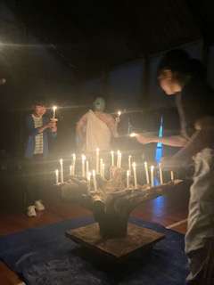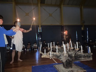 悪天候によりキャンプファイヤーからキャンドルファイヤーに変更。お昼のカッター体験は勾玉づくりに変更と。変更に変更が続きますが、52期生のパワーはそんなことも吹き飛ばして突き進んでます!