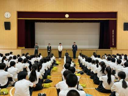 臨時の全校集会で、実習生の先生方よりお話がありました。