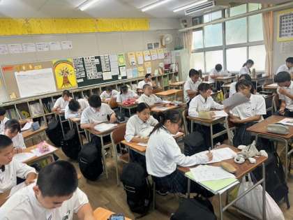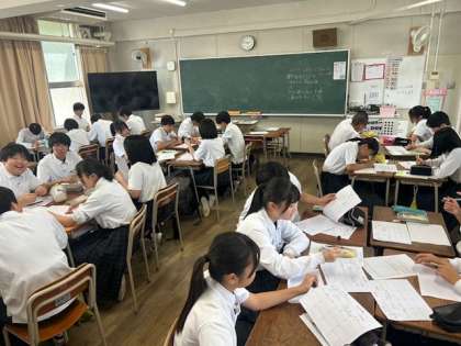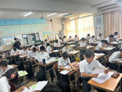 先週に班で作ったテスト予想問題を、みんなで解いています。