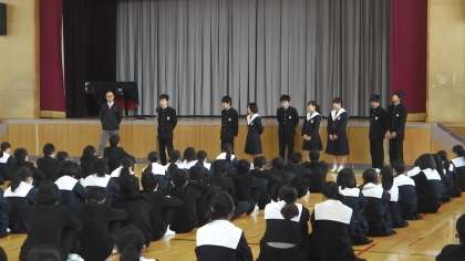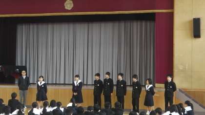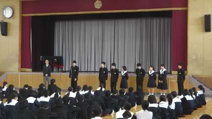 3月18日(金)の朝の学年集会の際に、1分間スピーチの発表会を行いました。国語科で取り組んだ1分間スピーチで、国語科とクラスから選ばれた8名の生徒が、『自分の好きな言葉』という題でスピーチを行いました。