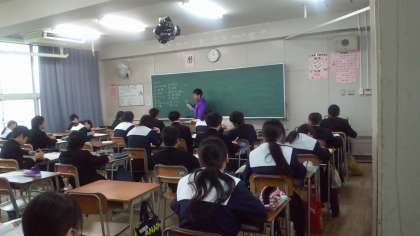 上の写真は2−4の理科の授業風景です。ちょうど地学分野で地震の説明を聞いているところです。みんなの表情は真剣でした。
