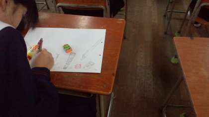 下の写真は1−1の美術の授業風景です。静物画でボンドのチューブやペンを描いていました。真剣で全員、なかなかの出来栄えでした。