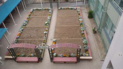 今日のふれあいガーデンの様子です。入学式・始業式とみんなの目を楽しませてくれたチューリップがなくなってます。技術部員が先週に整地してくれたようです。