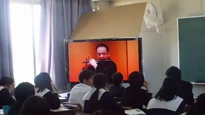 3年生の国語の授業中にモーツアルトの音楽が・・・・そのあと篠笛の音が聞こえてきました。西洋音楽と日本の音楽との違いについての説明らしいのですが、少し驚きました。