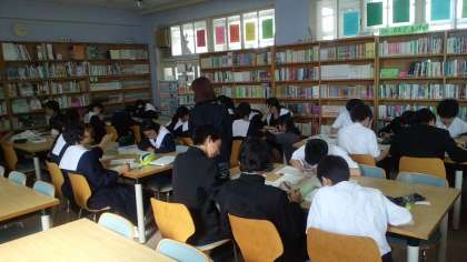 5月12日元気アップ学習会3日目の様子です。1年2年3年合わせて40名の参加でした。ほぼ図書室が満員の状態です。