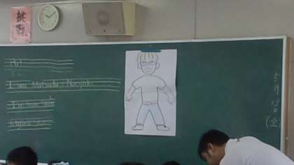 1年の英語の授業風景です。黒板に似顔絵?が貼ってあります。誰のでしょうかね?