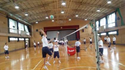 2年生の男子体育ではバレーボールの授業を行っています。上手な人も、そうでもない人も一生懸命です。下の写真はスパイクの練習なのですが、ちゃんと打てたのでしょうか?