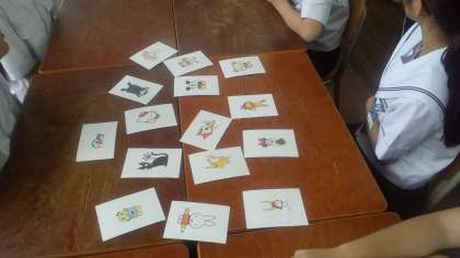 上は、英語の授業風景で、真ん中はその中で利用されたカルタ取りのカードです。