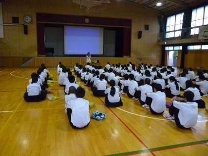 2年生は体育館で平和学習に取り組んでいます。