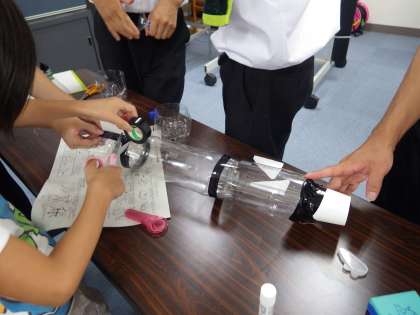 7月21日に、科学部が小学校で実施している科学教室を新北島小学校で実施しました。中学生の科学部員の指導の元で小学生がペットボトルロケットを作成していました。作成したペットボトルロケットは大会で飛ばしました。