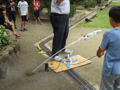 7月26日に平林小学校で、科学部が科学教室としてペットボトルロケット大会をひらきました。