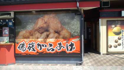 唐揚げの看板が食欲を誘いますが、昼食まであと一時間半あります。我慢しています。
