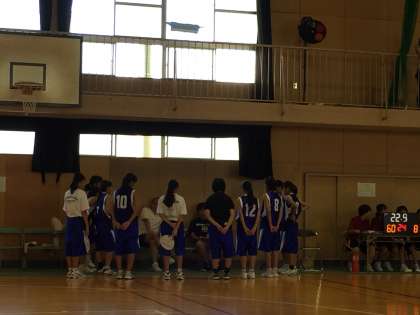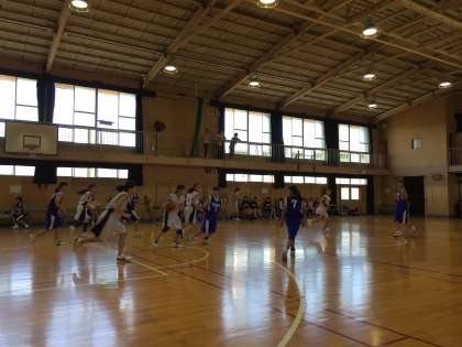 本日は、本校体育館において女子バスケットボール部の試合が行われています。第一試合では、対戦相手校に大差をつけて勝利しました。