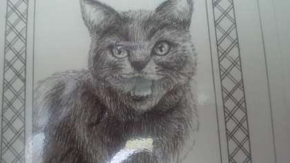 そのコピーが玄関の掲示板に張ってあります。どの作品も力作ぞろいですが、私(校長)はこのパンダのだらっとした表情と、猫の厳しい顔が好きです。みなさんはどうでしょうか?来校の折はペン画を是非ご覧になってください。又、美術館にも足を運んでください。尚、地下展示場は無料で見学できます。