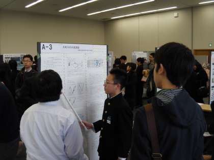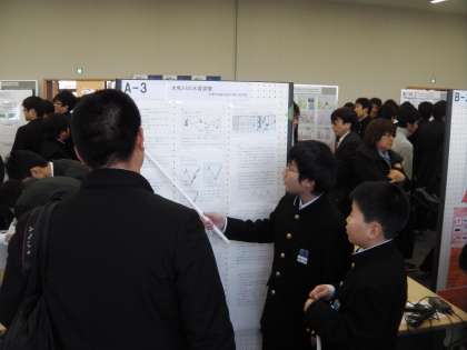 ポスターの前で1人で説明をして、高校生・中学生・顧問の先生などからいろいろと質問やアドバイスをもらっていました。