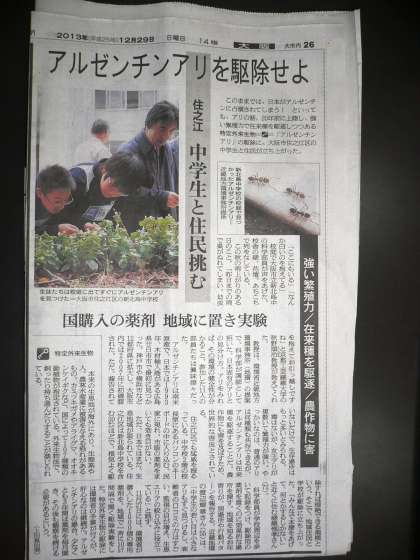朝日新聞 朝刊で、アルゼンチンアリ駆除の