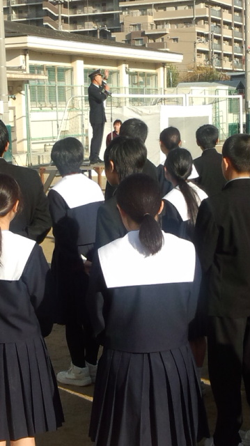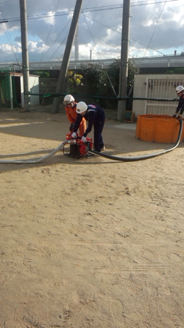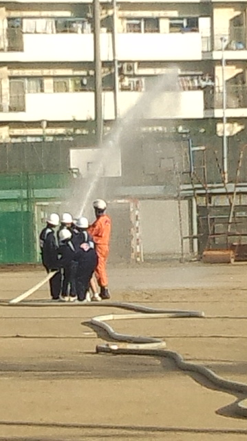消防署の方からのお話のあと、生徒会の生徒による放水訓練がありました。