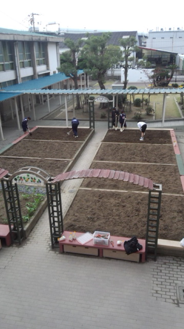 ふれあいガーデンで新たな、花や農作物を育てます。そのために、土を耕しています。春が楽しみですね。