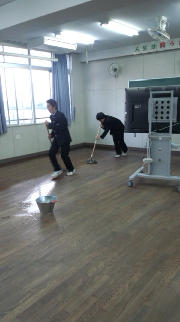 本校は一足制(運動靴で校舎、教室に入る)ですが、板張りの床はそれほど汚れが目立たちません。これは教室の床を保護するため、定期的に教室の油引きをおこなっているからです。今日は その日で、いつも以上に教室をきれいにして、油を引きます。