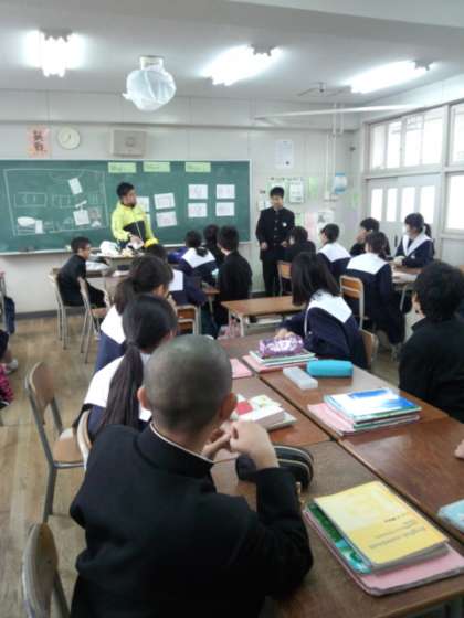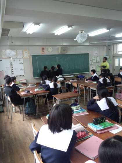 英語の研究授業の様子です。多くの先生方が参観しています。