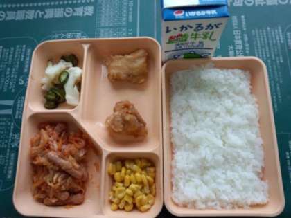 チキンとウインナーとコーンです。生徒に人気の食材です。