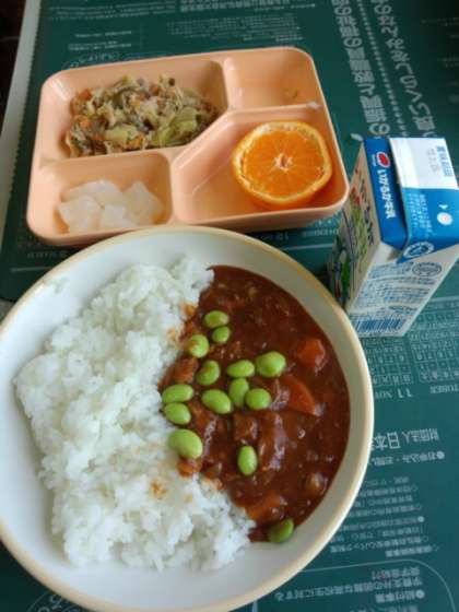 今日の給食です。ハヤシライスです。デザートにみかんが付いています。