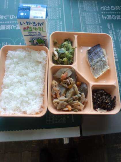 今日の給食です。いなか煮に魚が付いています。