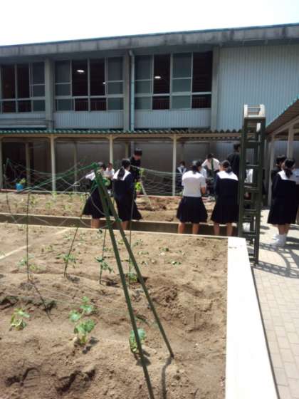 ふれあいガーデンで技術の授業での野菜つくりが始まりました。おいしい夏野菜の収穫に向けて取り組んでいます。
