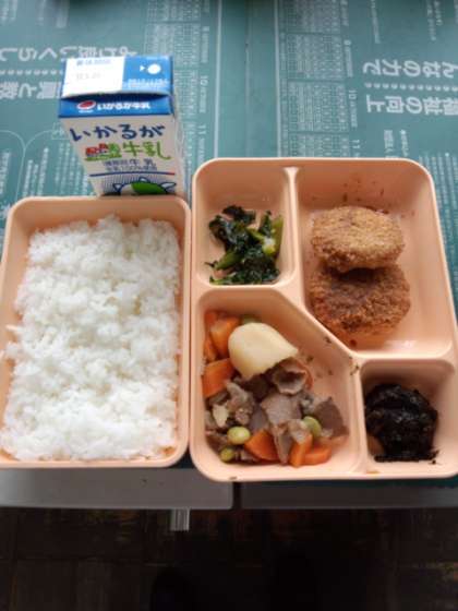 味噌カツと肉じゃがに小松菜のおひたし、のりの佃煮があります。