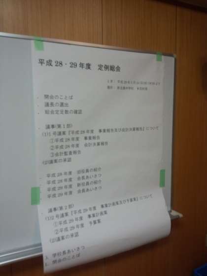 24日6時30分より新北島中学校PTA総会がありました。多数の出席ありがとうございました。28年度役員のみな様、1年間誠にありがとうございました。29年度役員のみな様1年間よろしくお願いします。