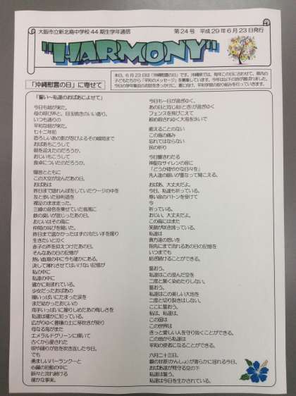 *昨日、6月23日(金)には、1年生の定例の学年集会がありました。この日はちょうど「沖縄慰霊の日」に当たり、泉先生からは沖縄戦の話を通し、平和についてのお話しがありました。かつての戦争において、日本で唯一地上戦が繰り広げられた沖縄。その戦没者を慰霊する日に当たり、自分たちの当たり前の生活を見つめてほしい。44期生として出会えた縁を大切にしてほしい。そんな願いが込められたお話しでした。この日の学年通信には「沖縄慰霊の日」に寄せて募集された「平和のメッセージ」を掲載しています。ぜひ一度ご覧ください。