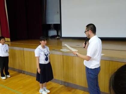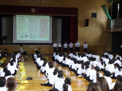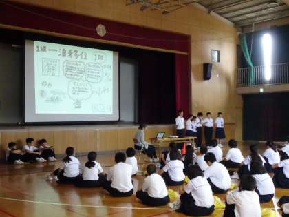 *本日、1年生は土曜参観で「一泊移住報告会」に取り組みました。44期生として一泊移住に取り組み、そこで学んだことの振り返りを学年全体で行いました。各班の班員が全員で前に立ち、大勢の前で堂々と発表を行ってくれました。どの班も精一杯取り組み、それを聴くみなさんの姿勢も素晴らしかったです。発表終了後、一泊移住コンテストの表彰も併せて行われました。入賞者・班には、学年全体から努力をたたえる拍手が送られていました。今回の取り組みを終え、さらに成長できたのではないでしょうか。学んだことを実際の生活にいかしていってもらいたいと思います。