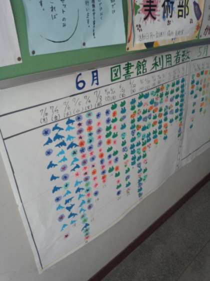 廊下に図書室の利用者数がグラフで示されています。昼休みの開放はしばらくありませんが、夏休みに図書を3冊まで借りることができます。ぜひ利用して読書の秋の前に読書の夏を過ごしてみませんか。