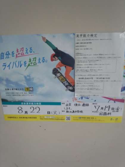漢字検定の申し込みは明日14日までとなっています。希望する人は国語の先生まで。