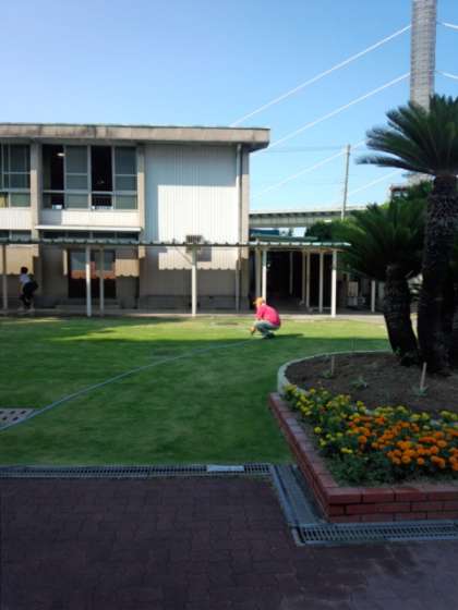 花壇の水やりや芝生の水やりは毎日行われます。本校のきれいな花壇や芝生には理由があります。
