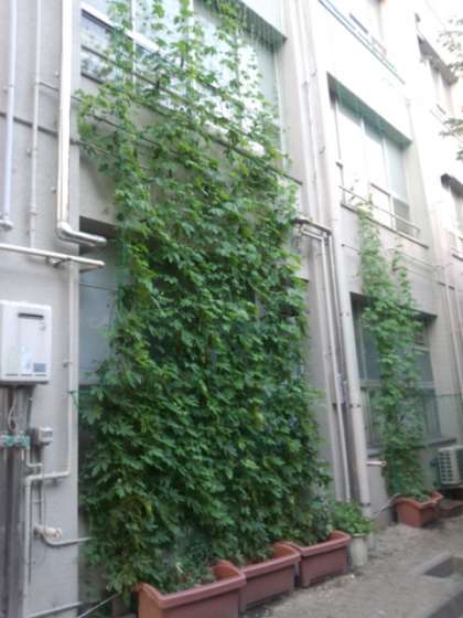 新北島中学校では緑のカーテンの取組みとしてゴーヤを植えています。
