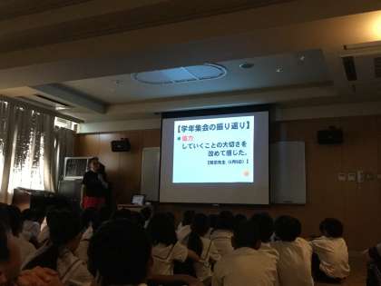 *昨日、7月19日(水)の2限は一学期最後の学年集会がありました。はじめに、学級代表から、各クラスの一学期の成果と課題の発表がありました。成果としては、一泊移住を通してクラスの絆が深まったことや、授業中に積極的に発言することができていることなどが挙げられました。その一方、課題としては授業と休み時間のメリハリがついていないこと、授業の準備が遅いことなどがあげられました。それらの発表を受け、学年代表が学年としての成果と課題を総括してくれました。