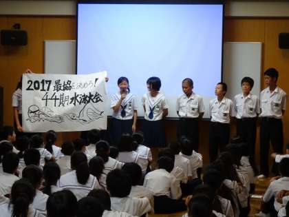 *最後に、体育委員のみなさんが、夏休み明けに実施される水泳大会に向け、気合の入ったタイトルと、意気込みを堂々と述べてくれました。