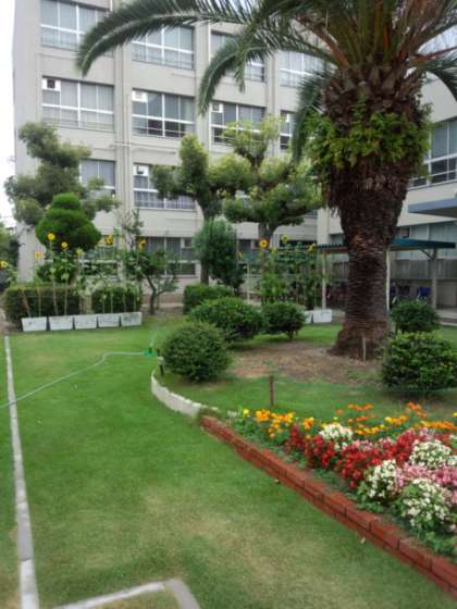 ・芝生の水やりも忘れません。、奥でひまわりもきれいに咲いています。