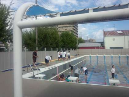 8月29日から各学年の水泳大会が行われます。水泳大会に備えてプールの掃除をしています。女子バスケットボール部とテニス部が手伝ってくれました。