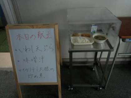 今日から給食が始まります。サンプルケースにその日の給食の盛り付けが出ます。