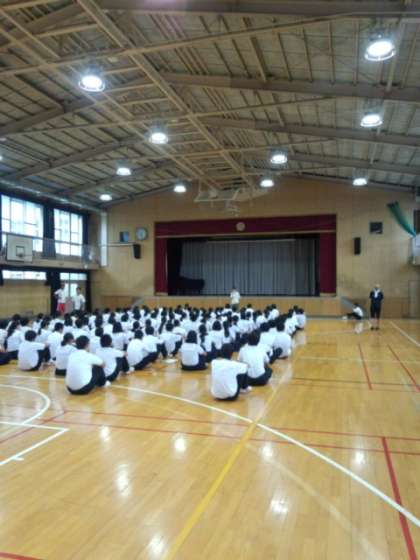 3年生の学年集会がありました。集会では水泳大会の表彰や班活動の役割の決め方についての話がありました。