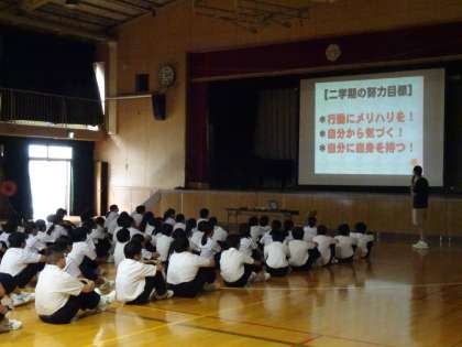 *昨日、9月6日(水)の6限、1年生は体育館で学年集会に取り組みました。二学期の始まりに当たり、二学期に意識して取り組んでもらいたいことを田邉先生から伝えてもらいました。一学期の成果と課題を思い返した上で、二学期の努力目標として、「メリハリのある行動を!」、「自分から気づく!」、「自分に自信を持つ!」の三点が示されました。先日立てた二学期の目標ともリンクさせながら、一人一人が個性をいかしつつ成長していってもらいたいと思います。