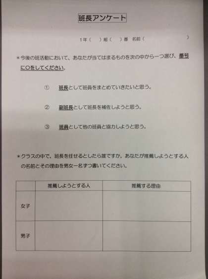 *集会の後は、各教室で二学期の班長選出のためのアンケートを行いました。選出された班長は、明日の放課後に実施される班長会議に取り組みます。班活動は、44期生の活動の基盤となる大切な取り組みです。班長に選出されたみなさん、よろしくお願いします。
