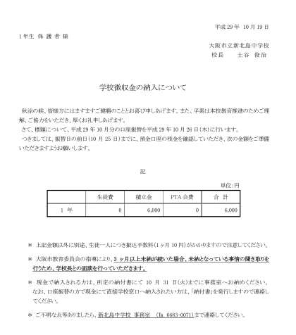 なお、現金で納入される方は、所定の納付書にて10月31日(火)までに学校事務室へお納めください。