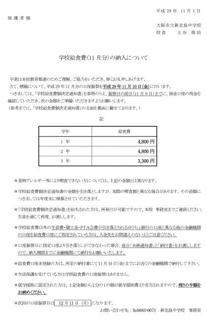 また、給食費口座未登録の方は、所定の納付書にて11月10日(金)までにお近くの金融機関で納付してください。