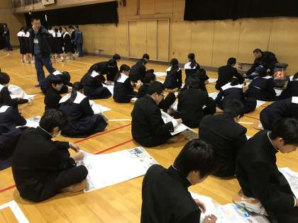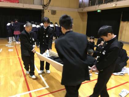 今日の5,6時間目に防災講座がありました。住之江区役所から防災担当の方が講師として7人来てくださいました。地震や津波に対する備えなどのお話がありました。また新聞紙でのスリッパ作りや毛布を利用したタンカで人を運ぶ練習です。