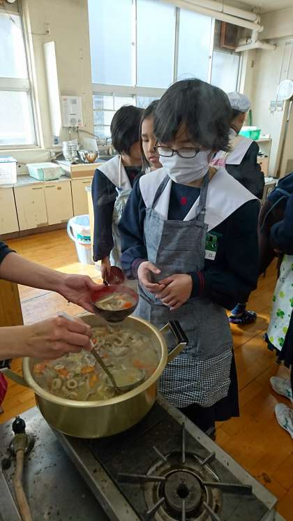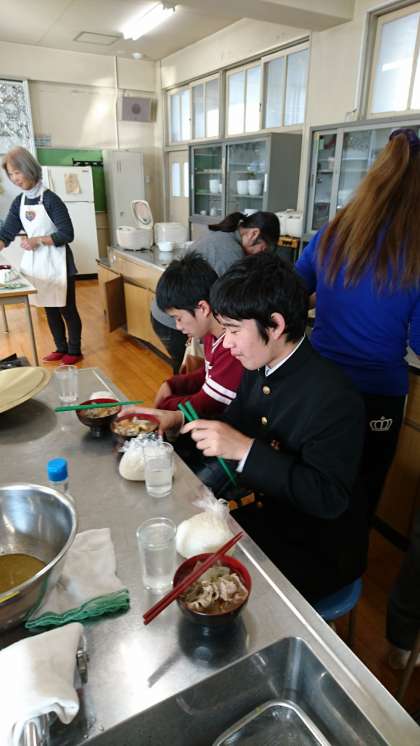 プレイルーム料理会が行われています。おいしい豚汁とおにぎりです。おいしくいただいてます