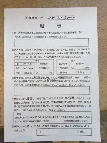 *今回の校外学習では、ピースおおさか、科学館、天王寺動物園、自然史博物館、下水道科学館、津波・高潮ステーションの、計6か所の施設から選択して見学しています。各施設ではその施設にちなんだクイズが課題として出題されています。また、その課題とは別に、ピースおおさかでは平和学習に関わるワークシートも配布されます。施設をくまなく見学し、全問正解目指してがんばってください!
